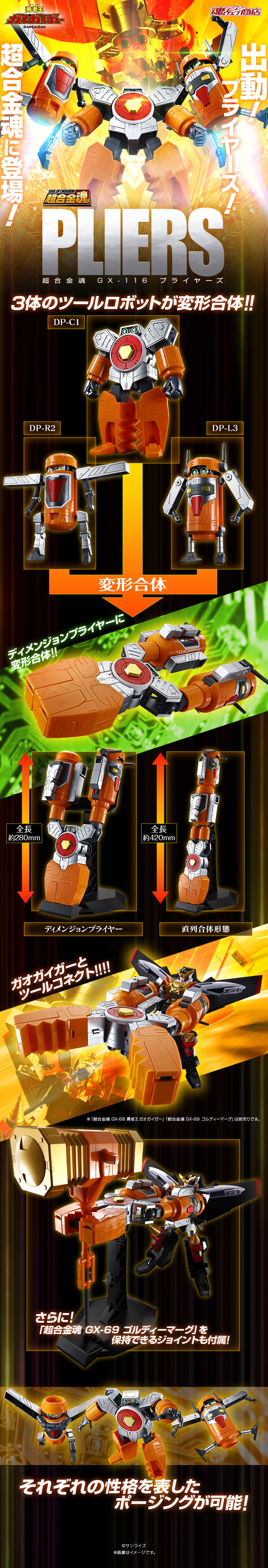 「DP-C1」「DP-R2」「DP-L3」각각의 상태에서도 관절이 가동. 전용 받침대를 사용하면,「디멘션 플라이어」「직렬 합체 형태」 각각의 단체 상태,「초합금혼 GX-68 용사왕 가오가이가」(별매)가 장비한 상태 어느 쪽이라도 안정된 디스플레이가 가능. 게다가,「초합금혼 GX-69 골디 마그」(별매)를 유지하기 위한 조인트도 부속!