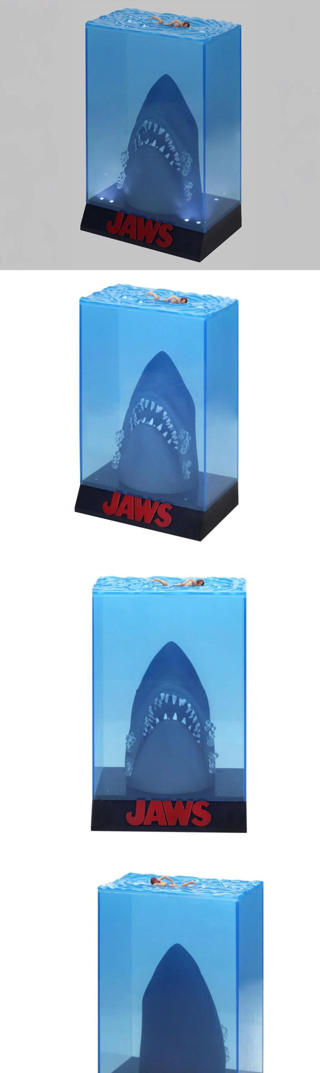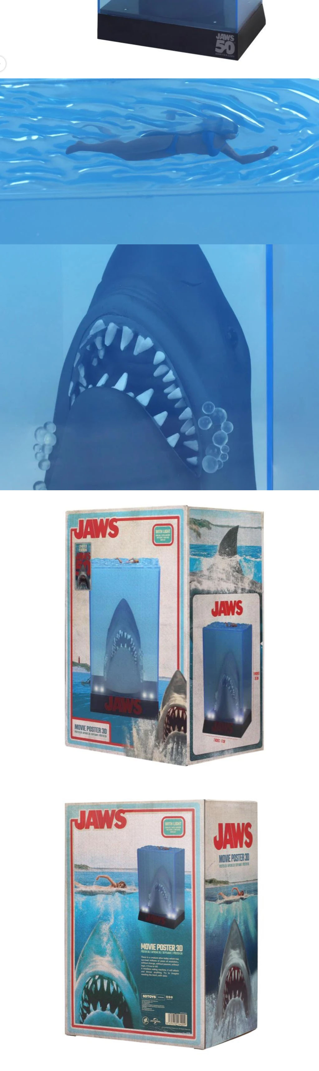 50주년 기념《죠스》 3D 무비 포스터 피규어는 1975년 개봉된 명작 영화 속, 거대한 백상어가 심해에서 솟구쳐 오르는 그 긴장감 넘치는 장면을 정교하게 재현했습니다.